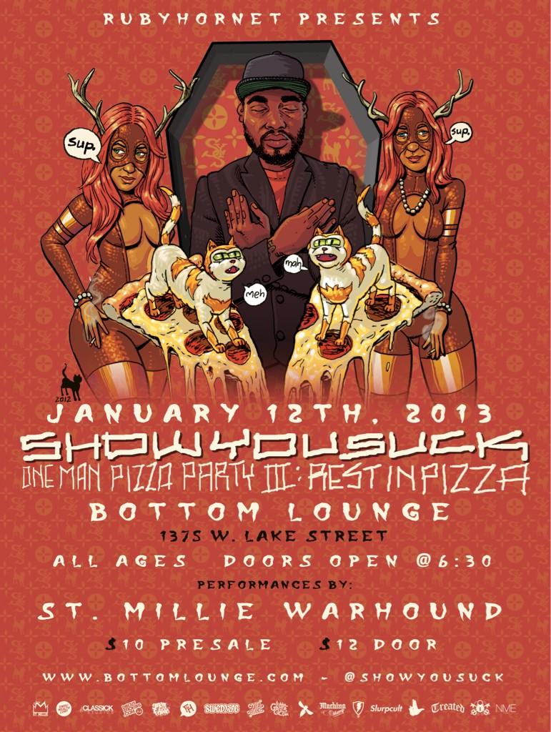 In support of the new release, here is the flyer for ShowYouSuck’s “One Man Pizza Party III: Rest In Pizza” release party. The release party, featuring performances from St. Millie and War Hound, will take place at Bottom Lounge on January 12 of next year; doors open at 6:30.