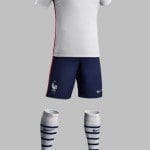 The three colors of the French national flag all appear with a red stripe that stretches along each side of the shirt and connects with a red stripe on each side of the shorts.