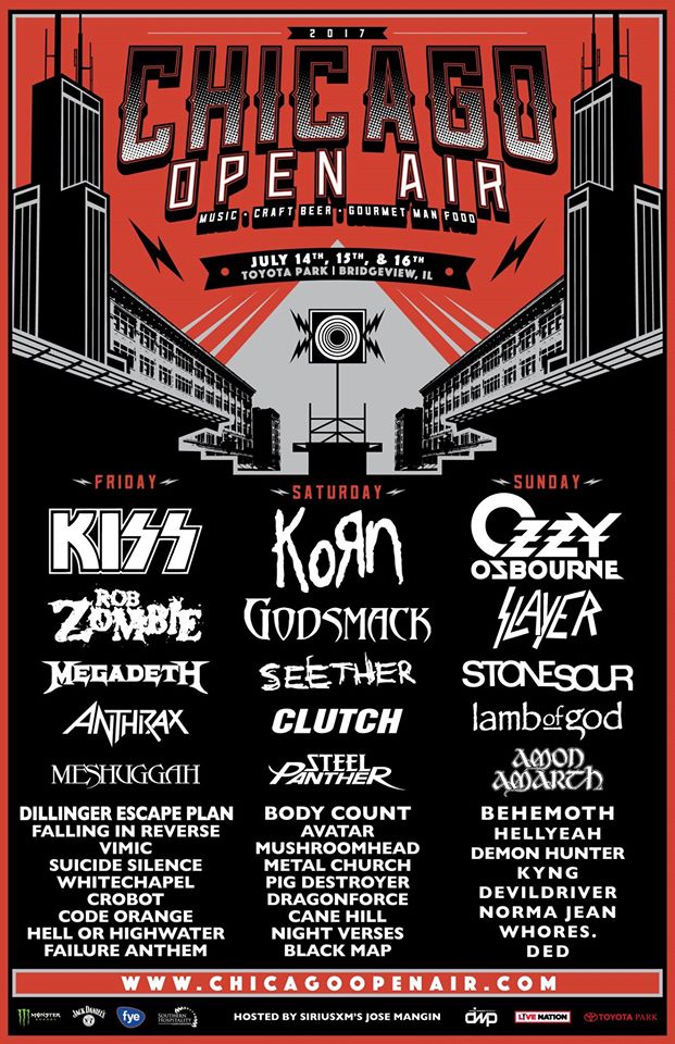 For 2017, #ChiOpenAir brought out the big guns and will be headlined by legendary acts KISS and Ozzy Osbourne performing on days 1 and 3 respectively, plus KoRn closing the show on Saturday. The rest of the lineup is just as killer, with Rob Zombie, Slayer, Megadeth, Anthrax, Stone Sour, Godsmack, Seether, Steel Panther, and Lamb of God all playing the festival.