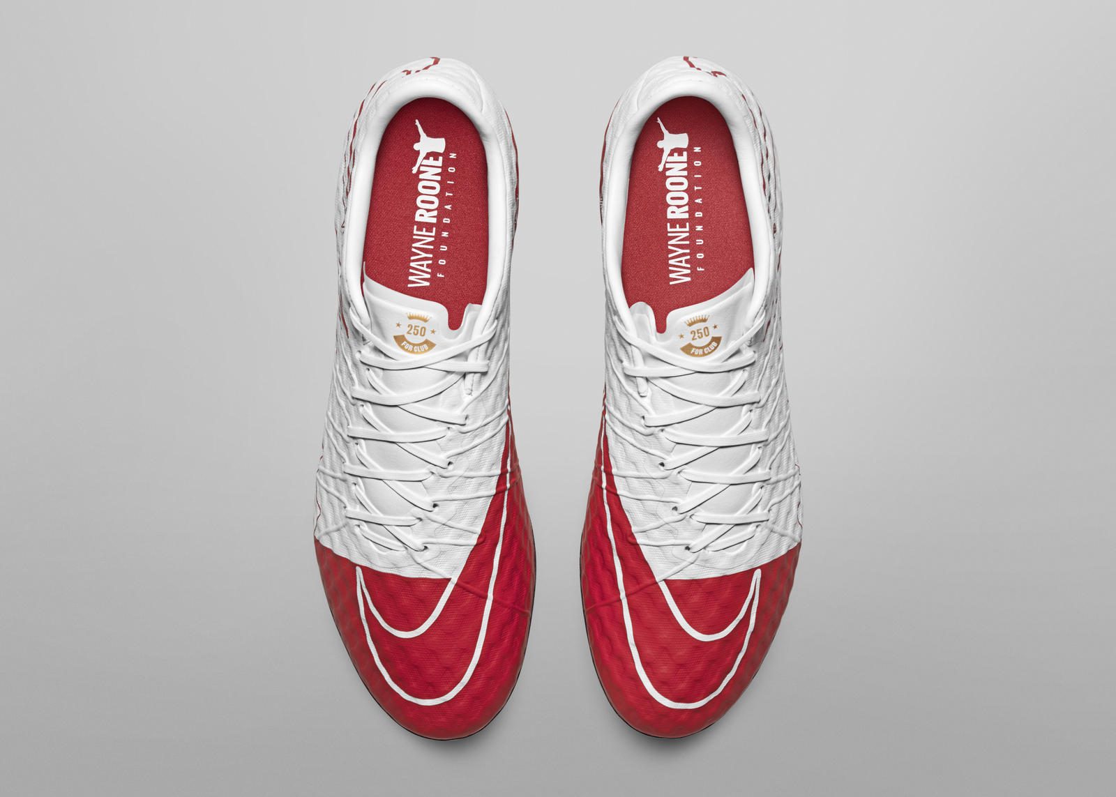 To celebrate the historic achievement Nike has announced the special edition Hypervenom WR250. The new kicks come in red and white, the colors he sports for both club and country, with a special logo created featuring a crown and his record breaking number on the tongue of the boot. According to Nike, when placed side-by-side, the pair forms the St George’s Cross across the uppers, connecting to England once more.