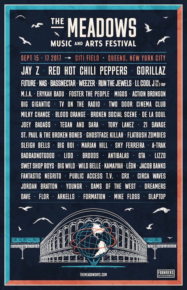 The Meadows Music and Arts Festival is coming in strong for its second year, with a lineup that has Jay Z, Red Hot Chili Peppers, and Gorillaz as the headliners. Taking place September 15-17 at Citi Field in Queens, New York, the fest will also see performances from Nas, Run the Jewels, Future, Weezer, Migos, Action Bronson, LL Cool J, Erykah Badu, Blood Orange, Broken Social Scene, Big Boi, TV on the Radio, Joey Bada$$, Sleigh Bells, A-Trak, Foster the People, Ghostface Killah, De La Soul, and more.