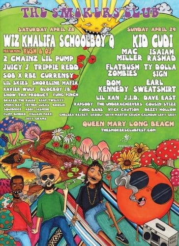 The lineup for The Smokers Club Fest taking place at the end of April this year in Long Beach has been revealed and it is truly a special one. Headlining on the second day of the fest is none other than Kid Cudi, but thats not the only highlight. Wiz Khalifa will also be performing Kush & OJ in its entirety. That is definitely going to be a sight to see. Check out the rest of the lineup above featuring the likes of ScHoolboy Q, Mac Miller, Isaiah Rashad, Earl Sweatshirt and many, many more.