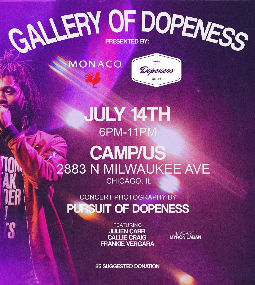 As you may have noticed by now, we go to a lot of concerts, and we love to celebrate the music culture that we have here in Chicago so we decided to do a thing. On July 14th, we are hosting our first ever Gallery of Dopeness at Camp/us!