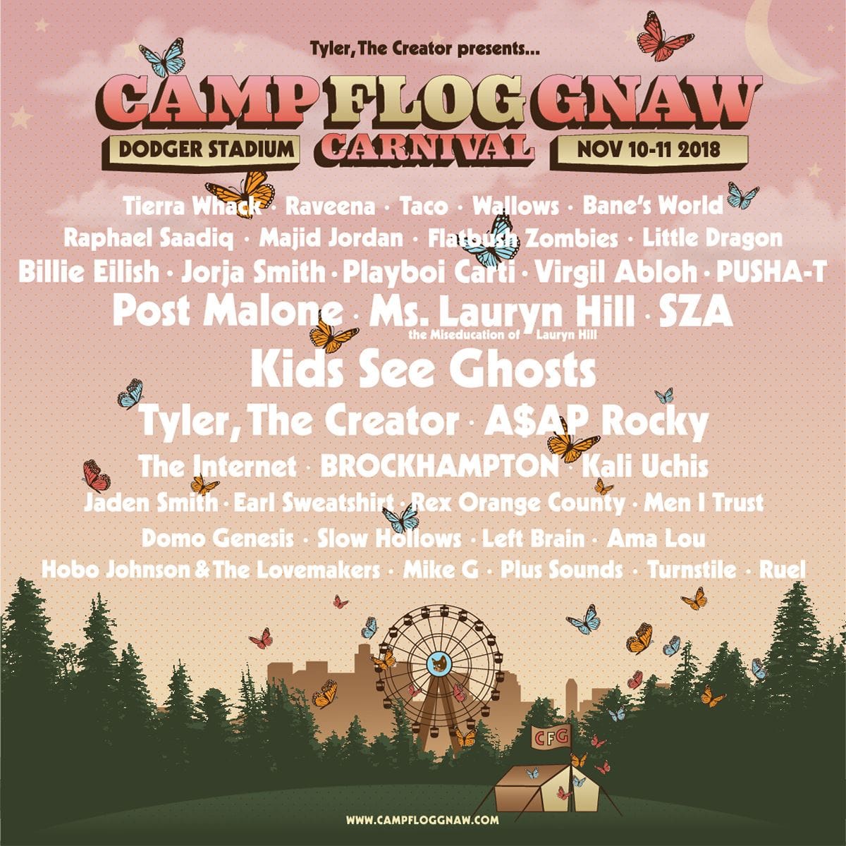The headliners alone are ridiculous, with Tyler himself along with A$AP Rocky and the duo Kids See Ghosts (Kanye West + Kid Cudi). Also featured on the lineup are SZA, The Internet, Ms. Lauryn Hill, Kali Uchis, BROCKHAMPTON, Virgil Ablog, Playboi Carti, Rex Orange County, Post Malone, Jorja Smith, Billie Eilish, Pusha-T, and Virgil Abloh. That’s just the main main artists, and