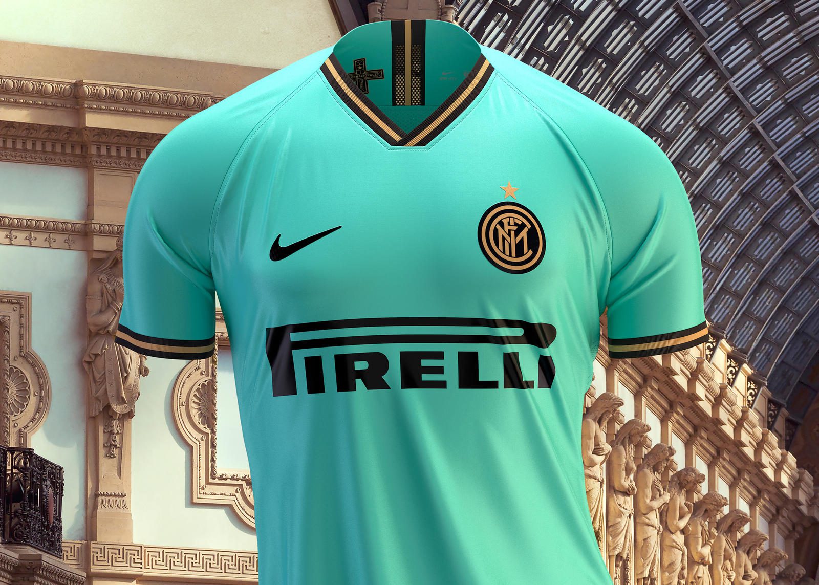 The shirt draws inspiration from Julio Cesar’s goalkeeper’s kit that he wore the season after winning the historic treble in 2009-10, adding black and gold trim for the collar and sleeves, but also on the club badge. The inside of the shirt features a Milanese cross that pays tribute to the architecture of the city’s cherished Duomo.