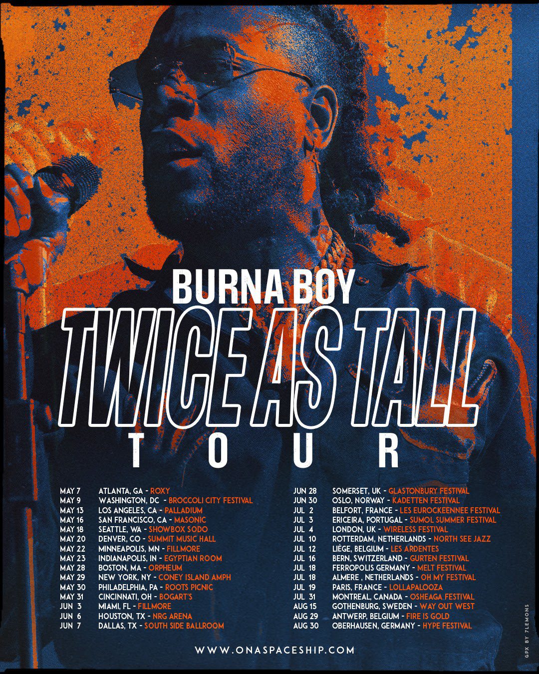 Burna Boy has announced his 2020 tour. The Twice As Tall Tour will start on May 7 in Atlanta and will conclude its U.S. journey a month later on June 7 in Dallas. From there, the Nigerian star will cross the Atlantic to play sets at European festivals including Oslo’s Kadetten Festival, London’s Wireless Fest, and Lolla Paris.
