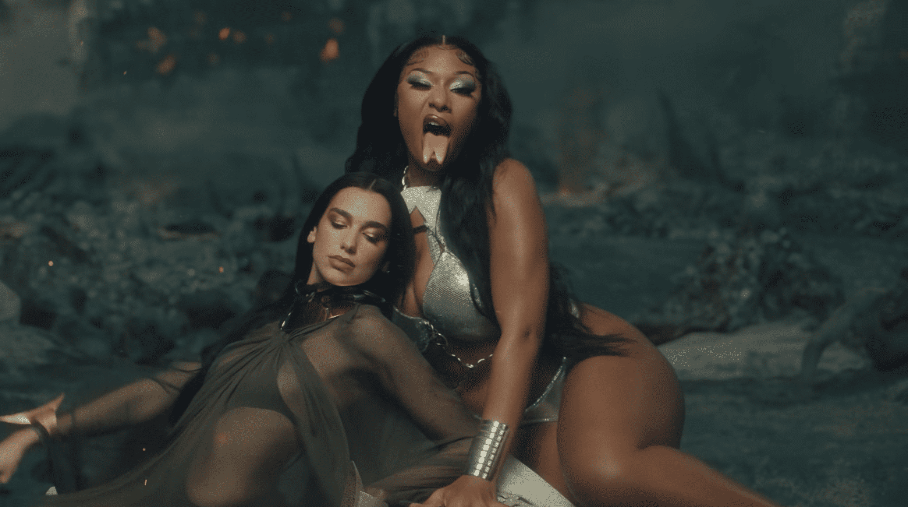 The visual features some wild and trippy imagery including a spider crawling under Dua’s skin, hands feeling up the fellas chilling in a boiling cauldron as Megan shows off she’s got the best knees in the game, and a chunk of pie coming out of Dua’s cheek implying she’s made out of (the sweetest-) pie. The duo responds to the rebels trying to burn them at the stake by turning the flames right back at them and scorching them Pompeii style.
