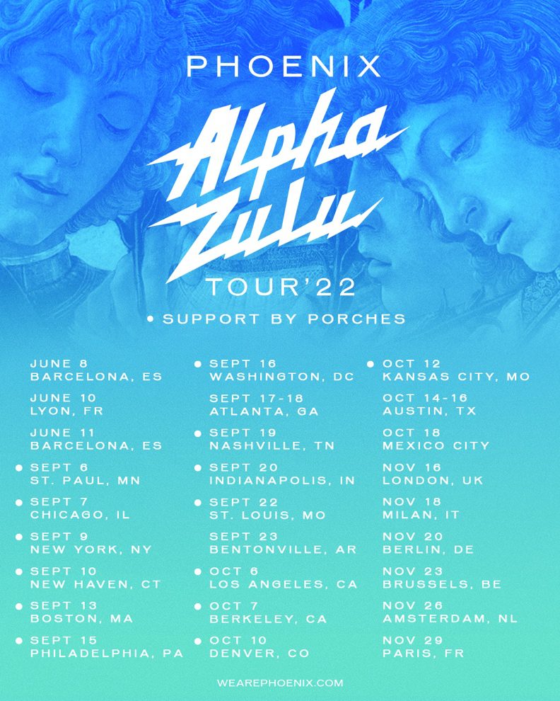 Phoenix rises once more. One of our favorite French outfits have announced today that they hitting the road this year as part of their Alpha Zulu 2022 Tour, for which they will follow-up some summer dates in June with a run of shows across Europe and North America this September-November. Phoenix fans  will be able to see them in cities like Chicago, New York, New Haven, Indianapolis, Mexico City, London, Milan, Berlin, and Paris.