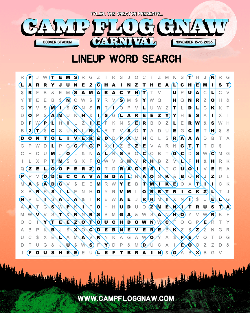 Earlier in the day, the Carnival’s social channels offered a chance to figure out the 2025 roster via a word search, and now we can confirm who is playing the Camp Flog Gnaw this year. Among the names that stood out the most are A$AP Rocky, AZ Chike, Bb Trickz, CA7RIEL & Paco Amoroso, Childish Gambino, Clairo, Clipse, Doechii, Don Toliver, Earl Sweatshirt, GloRilla, Men I Trust, Paris Texas, T-Pain, Teezo Touchdown, TEMS, Thundercat, Tyler, the Creator, Zack Fox, and many more.